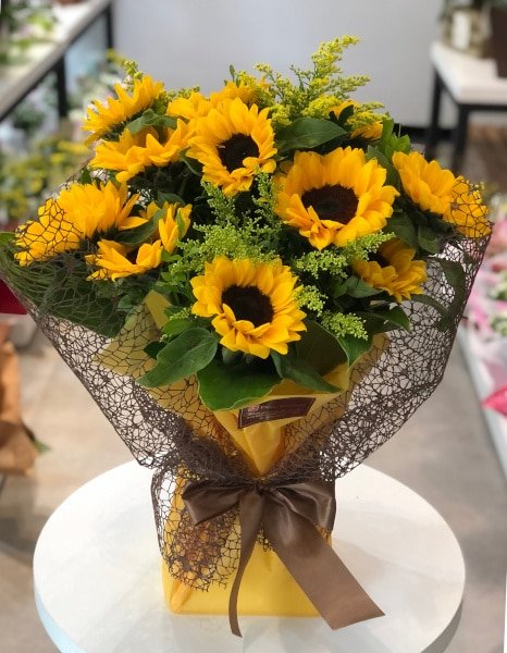 Buquê com 12 girassóis naturais, com acabamento em tango e folhagens.