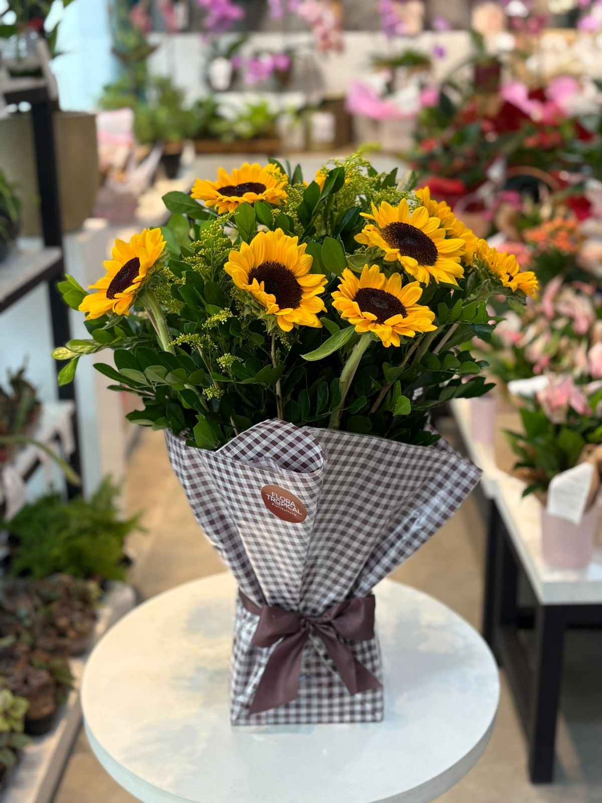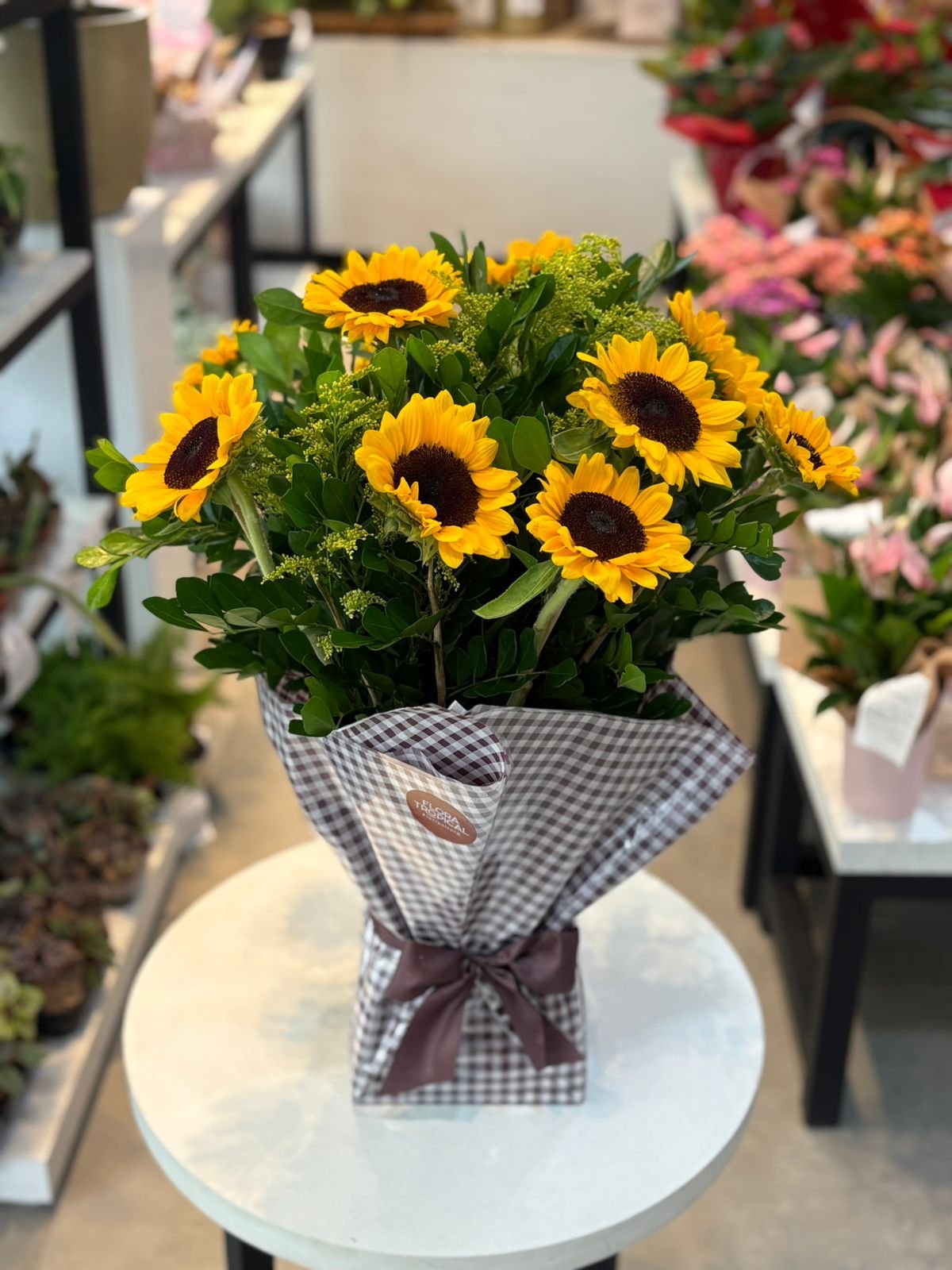 Buquê com 12 hastes de girassois e complementos em exclusiva caixa kraft com água e conservante embalada para presente para maior durabilidade das flores.